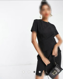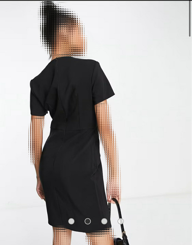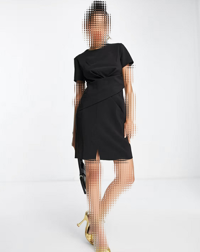 این لباس مشکی ساده و بسیار شیک، طراحیای مینیمال اما هوشمندانه دارد که برای موقعیتهای رسمی و نیمهرسمی بسیار مناسب است. یقه گرد و آستینهای کوتاه آن جلوهای کلاسیک و موقر به لباس میبخشند، در حالی که برش مورب روی بالاتنه و پایینتنه باعث ایجاد فرمی خوشتراش و اندامی میشود.