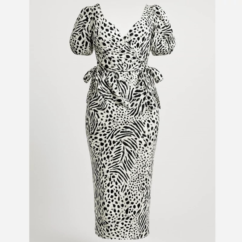 با این پیراهن جذاب میدی با طرح پلنگی سیاهوسفید، جسورانه و خاص ظاهر شوید! طراحی این لباس با یقههفت دراپدار، آستینهای پفی و کمربند گرهای در دو طرف کمر، بهزیبایی فرم بدن را برجسته میکند و ظاهری زنانه و شیک به شما میدهد. پارچهی لطیف و سبک آن با چاپ ترکیبی حیوانی (لئوپارد و گورخری) حس جسارت و اعتمادبهنفس را القا میکند. این مدل مناسب مهمانیها، دورهمیهای خاص یا حتی قرارهای شام است — جایی که بخواهید متفاوت باشید و بدرخشید.