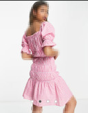 پیراهن زنانه کوتاه چهارخانه مجلسی صورتی نخی