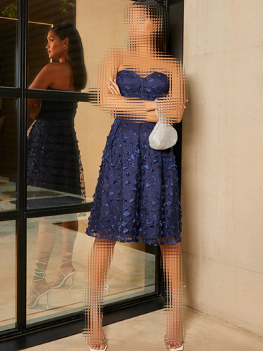 پیراهن زنانه کوتاه مجلسی سرمه ای برند چی چی لاندن جنس تور و حریر آستردار